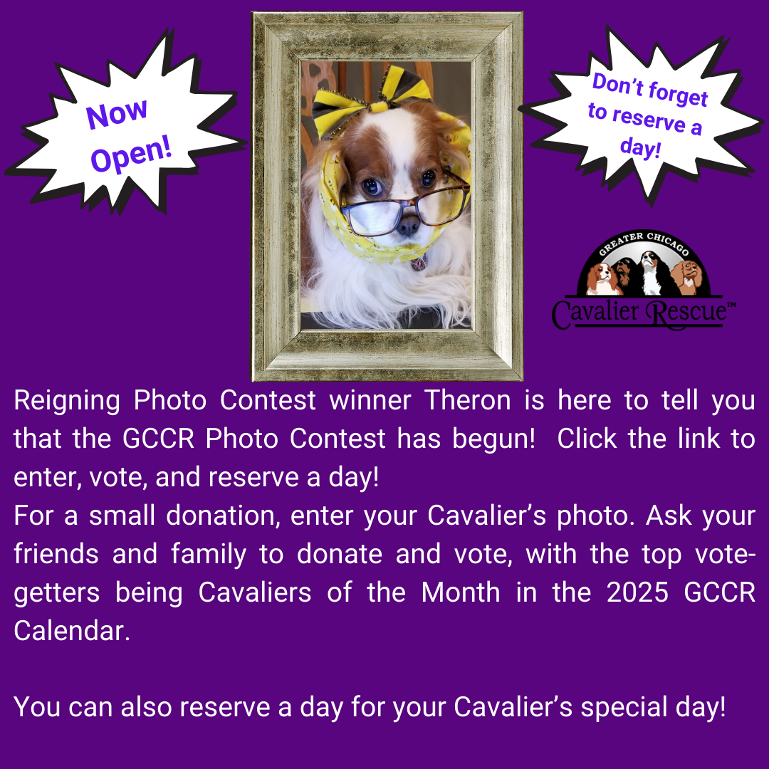 For a small donation, enter your Cavalier’s photo. Ask your friends and family to donate and vote, with the top vote-getters being Cavaliers of the Month in the 2025 GCCR Calendar.