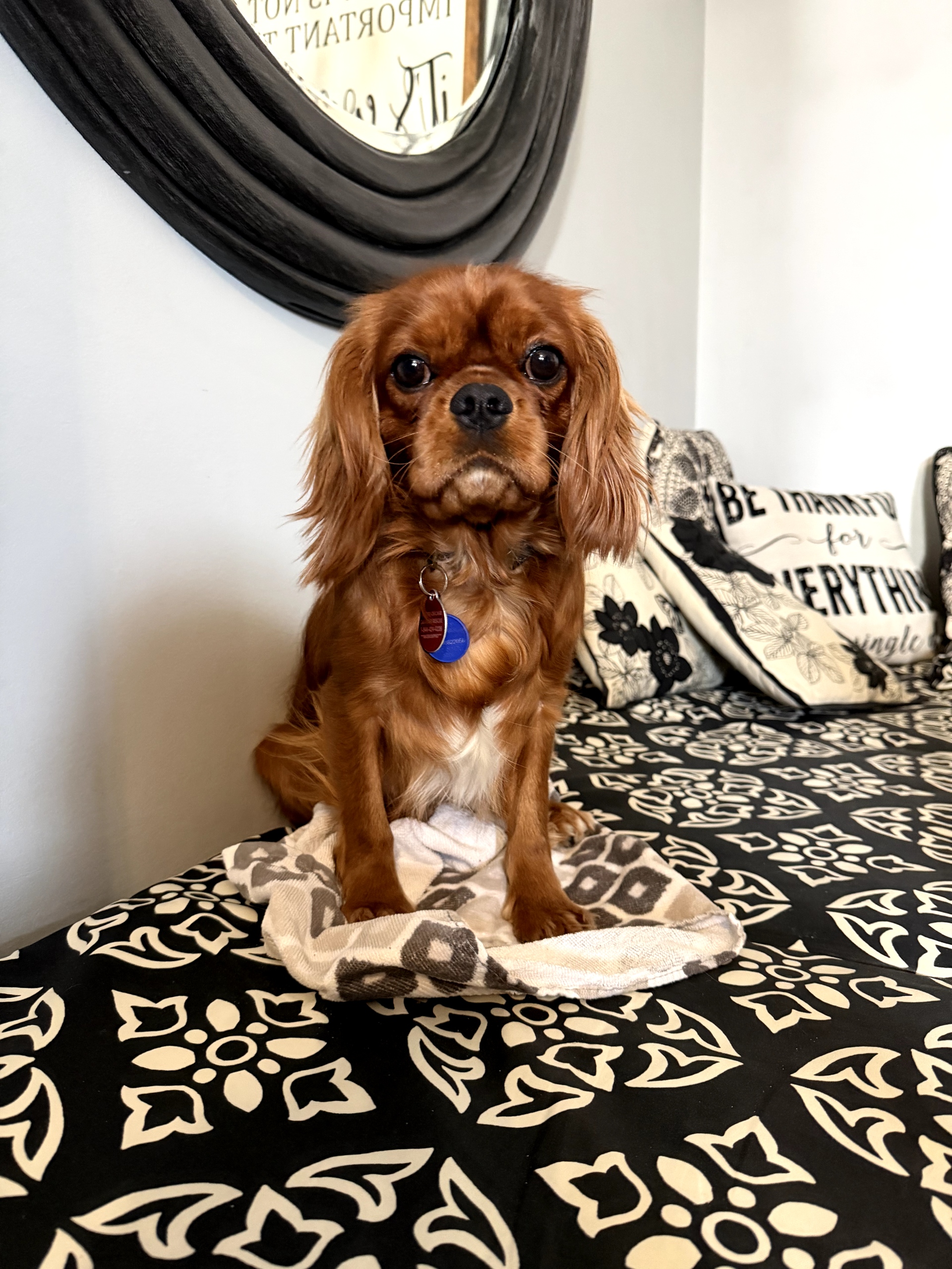 Porky is a handsome, 7 year old, black and tan Cavalier who needs a loving forever home. He is very sweet and easy going and is coming out of his shell more and more. He is active playing and exploring in the yard and chewing on a few favorite toys, but is quiet most of the day. Porky is cautious and hand shy but has no aggressive behaviors. We know he is compatible with most men, women, and kids over 5 years old and, so far, with other dogs he has met. Porky likes car rides, walks on a leash, is used to wearing a collar, is mostly housebroken, and has made some progress with commands like “sit” and “stay.” As with many rescues, it will take time for him to trust you enough to let you pick him up, however, he finds comfort sitting on the couch with you and letting you pet him. Porky loves a balance of naps and play and will sleep through the night in a gated room (right now he sleeps with his foster Cavalier brothers.) If you have a nice fenced yard and a place for walks, and preferably a family dog (or two), Porky would make your family complete.