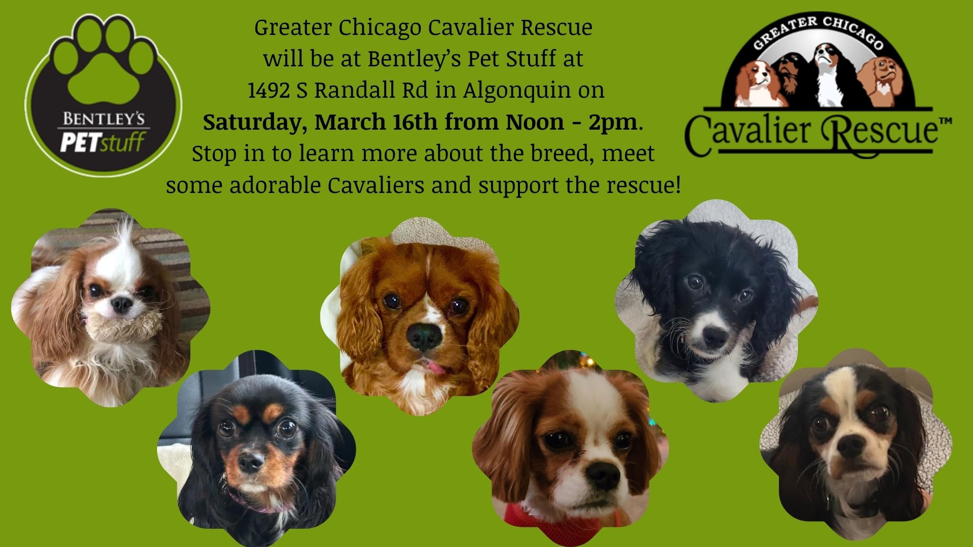 Stop in with your Cavalier, learn more about the breed, meet some adorable Cavaliers and support the rescue! Do a little shopping at Bentley's.