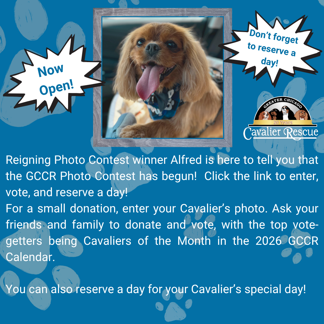 For a small donation, enter your Cavalier's photo.  Ask your friends, family, and co-workers to donate and vote, with the top vote-getters being Cavaliers of the Month in the 2026 GCCR Calendar.